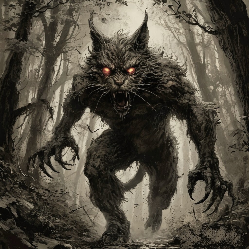 Он успел уклониться и со всего маху ударить серебряным кастетом туда, где, по его предположению, у нападавшей твари была пасть. Удар достиг цели, но… Прыгнувшее на него существо было размером с телёнка. Абсолютно чёрная, с горящими красными глазами, по-кошачьи гибкая тварь была одержима безумной голодной яростью. Охотник лишь слегка оцарапал её челюсть.