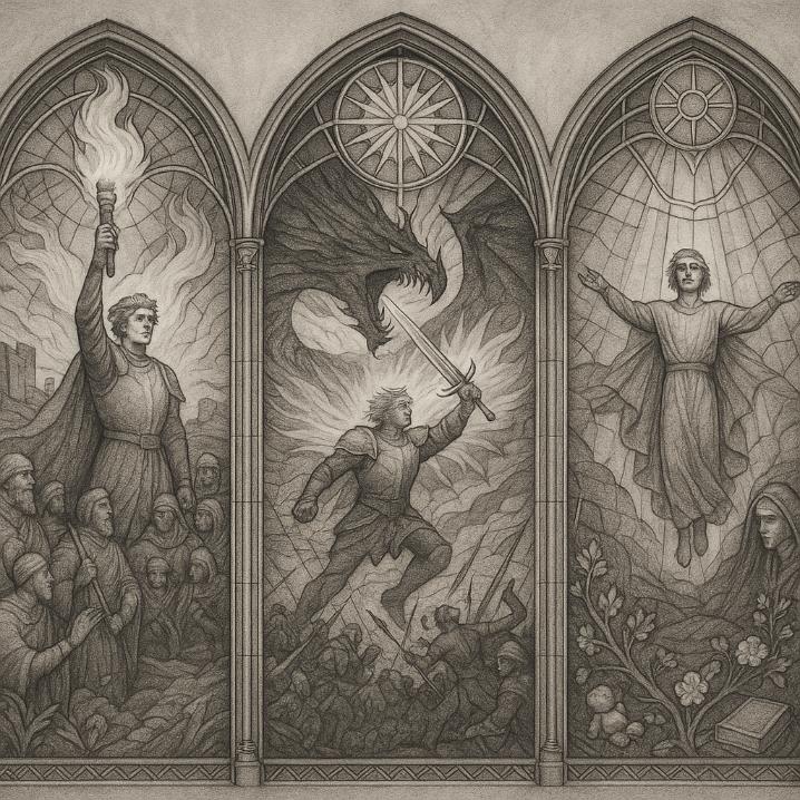 Он сорвал с себя плащ, обнажая сияющий доспех, исполосованный шрамами прежних битв. Вытянул меч, пылающий в отблесках крови, и с вызовом поднял его к небесам.