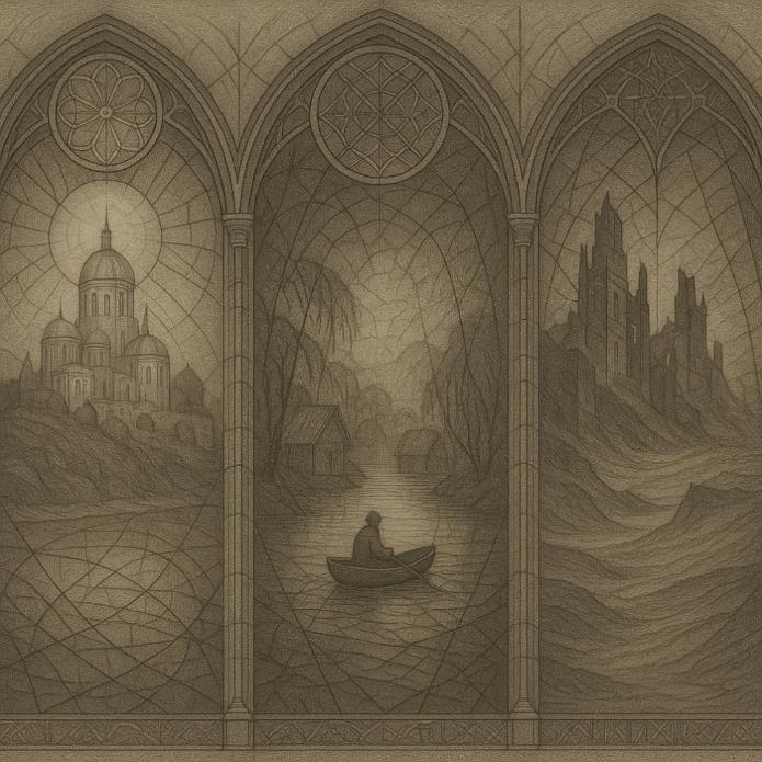 В тот день город был особенно наряден. Разноцветные знамёна развевались на улицах – в этот раз боги решили отмечать своё присутствие именно так. Мраморные колонны вздымались ввысь, приобретая невообразимые оттенки и формы. Улицы изгибались под немыслимыми углами, то сужаясь до размеров игольного ушка, то расширяясь до океанических просторов. Но все дороги вели к одной точке – сцене, чьи эпические декорации пока ещё скрывала тяжёлая ткань.