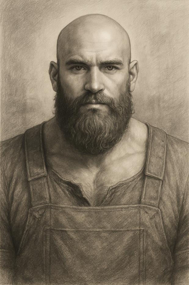 Вормот, ненормально огромный даже по меркам шахтеров, выделялся в толпе на фоне этой махины. Лысая голова, возвышавшаяся на полноценную длину роста Аша над окружающими, блестела в утреннем свете, а густая рыжая борода, доходившая почти до груди, шевелилась, когда он ворчал. Лицо суровое, с первыми морщинами, но в его взгляде, когда он смотрел на Аша, всегда теплилось что-то мягкое. Голос великана гремел, словно обвал в шахте, а смех, перекрывал все вокруг.
