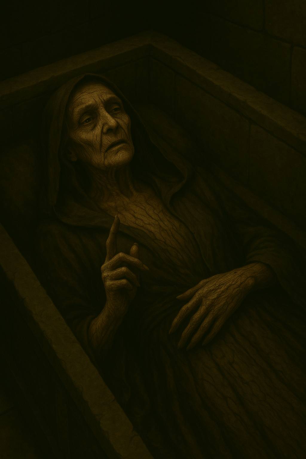 Когда она вошла, её взгляд остановился на склепе. Там лежала Кора, её тело было странным, словно деревянным, с трещинами, которые напоминали старую кору дерева. Её дыхание было тяжёлым, а голос – слабым, но всё ещё пропитанным тьмой.