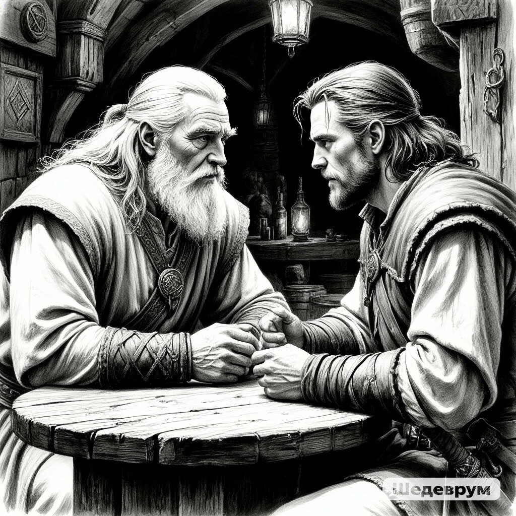 Фея взяла одну серебряную монету и, взмахивая светящимися крылышками, улетела. Через минуту она доставила к указанному столику угощение и прошептала просьбу Анаэрто на ухо сидящего к нему спиной волшебника. Альмен обернулся, их взгляды встретились. Волшебник поднялся со своего места. Он оказался довольно высокого роста, темноволосым. На лице была заметна щетина. На поясе у него с одной стороны висели ножны с полуторным мечом, с другой – ножны с двумя боевыми кинжалами. Альмен произнёс короткую фразу своим товарищам. Видимо, извинился, что вынужден их покинуть. С кружкой в руке он подошёл к столику Анаэрто. По человеческим меркам волшебник выглядел довольно молодо, не более тридцати лет.
