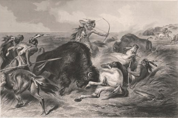 Огромные стада бизонов бродили от Саскачевана до Рио-Гранде. Охотники прекрасно знали их тропы и места, где они пересекали реки вброд. Но лишь с появлением лошади тактика охоты изменилась. Теперь можно было охотиться даже на достаточно удалённом от лагеря месте (например, апачи могли уйти от лагеря на расстояние в несколько дней пути). Услуги «зазывателей бизонов» больше не требовались – основной тактикой стало преследование убегающего стада и поражение животных стрелами или копьями (иногда применялись ружья). Вначале высылались разведчики. Они оценивали численность стада, местность, возможные пути движения бегущих бизонов и т.п., расставляли людей и давали сигнал к началу охоты. Охотники верхом на специально обученных «охотничьих» или «бизоньих» пони выскакивали из засады и начинали облаву на испуганное стадо. Всадники-лучники являются чисто индейским изобретением. Они не могли позаимствовать эту идею ни у испанцев (поскольку те не использовали лук для охоты, а во время боевых действий испанские лучники сражались в пешем строю), ни у монголов, ни у кого-либо ещё. Интересно то, что, хотя охотник, как и воин, действовал индивидуально, его действия всё же были слажены с действиями других охотников или воинов. Охота на бизонов развивала не только навыки стрельбы из лука, но и способность действовать согласовано, в одной команде, что было очень полезно во время боевых действий.