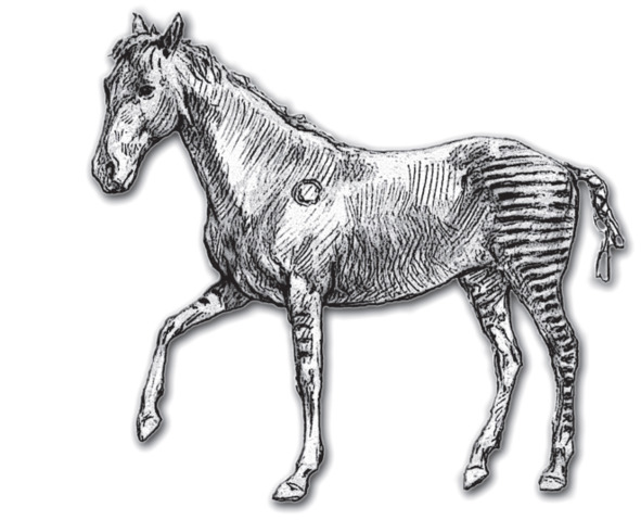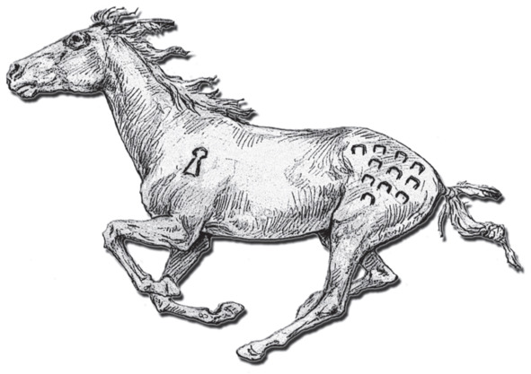 Следы копыт или подков, нарисованные на крупе лошади, также указывали на количество угнанных пони или успешных набегов за лошадьми. В ранние времена след подковы изображался как четверть круга – чтобы подчеркнуть, что зацеп лошадиного копыта совсем не похож на следы, оставляемые другими травоядными. С приходом белых рисунки стали постепенно принимать подковообразную форму. Для обозначения лошадей, угнанных у белых, применяли символ подковы: дугу с двумя поперечными линиями у основания. Со временем дугообразные символы стали более похожи на прямоугольники без одной стороны, потому что индейцы заметили, что у диких лошадей копыта стачиваются именно таким образом. Кроме того, данный символ легче было вышивать бисером, чем полукруглый.