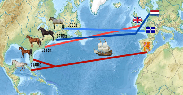 С появлением и расцветом английских колоний в 40-х годах XVII века на Юге современных США, на восточное побережье прибыли и английские породы. Английских чистокровных было не так много – ими занимались в основном, аристократы, а вот рабочих и упряжных было предостаточно. Правда на равнины к индейцам они попали только через сто-сто пятьдесят лет. В 80-х годах того же XVII началось относительно активное освоение Канады в районе Гудзонова залива французскими торговцами и переселенцами. Но французы, по большей части, везли тяжелых упряжных лошадей для работы и перевозки грузов в зоне канадских лесов, и индейцев они не интересовали. А вот путешественники, отправлявшиеся на равнины или в Скалистые горы, предпочитали покупать легких верховых лошадей в английских поселениях, где их было больше, да и стоили они дешевле. Последними, в начале XVIII века, в Америку прибыли голландские лошади. Это были рысаки и упряжные породы. Они оказали некоторое влияние на формирование американских пород, но практически никак не влились ни в линию мустангов, ни в породы индейских лошадей.