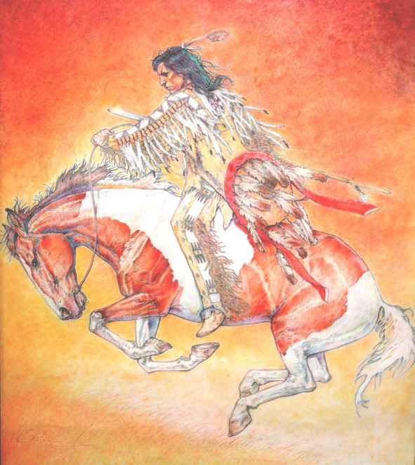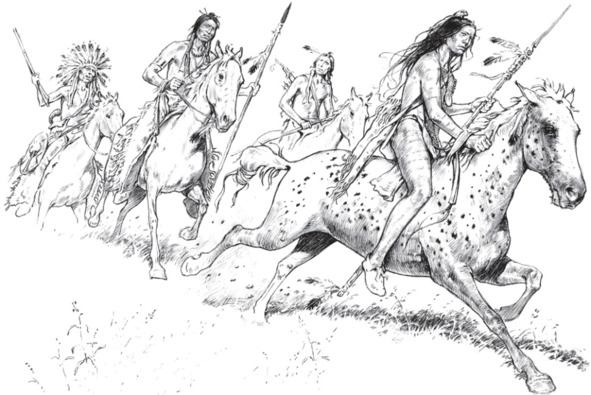 Действительно, на большей части Великих Равнин водились низкорослые, коренастые лошадки пятнистой расцветки, часто называемые «пинто» или «индейскими пони». До сей поры существуют две масти, называемые «оверо» и «тобиано», при этом окрас лошадей этой породы может быть абсолютно любым, включая редкие и, вроде бы, не свойственные лошадям цвета. На телах пинто нередко встречаются отметины, раньше принимаемые индейцами за символы молнии, отпечатки копыт, рук, щитов, головных уборов и т. п. Пинто зачастую путают с мустангами – дикими лошадьми американских прерий, но эта порода, имея среди своих предков берберских, арабских и андалузских благородных скакунов, была выведена специально, хотя и не без участия выросших на воле и приспособившихся к суровому климату мустангов. В свою очередь, табуны мустангов постоянно пополнялись пинто, по разным причинам покидавшими индейские табуны.