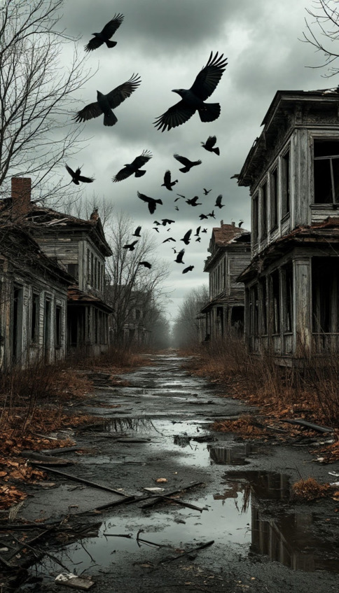 Птицы не пели. Да что там, пернатые даже над головой не пролетали. Дома разрушались, чёрные оконные проёмы выглядели раззявленными ртами, тут и там виднелись дыры-раны. Деревья походили на торчащие иссохшие кости. В общем, жуть.