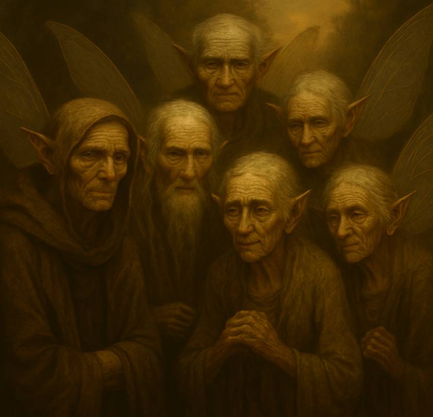 Перед ним возникли шесть силуэтов стариков и старух. Они выглядели так, будто скоро умрут: дряхлые и старые, с прозрачными крыльями и заостренными ушами. Их лица были испещрены морщинами, а глаза светились древней мудростью и печалью.