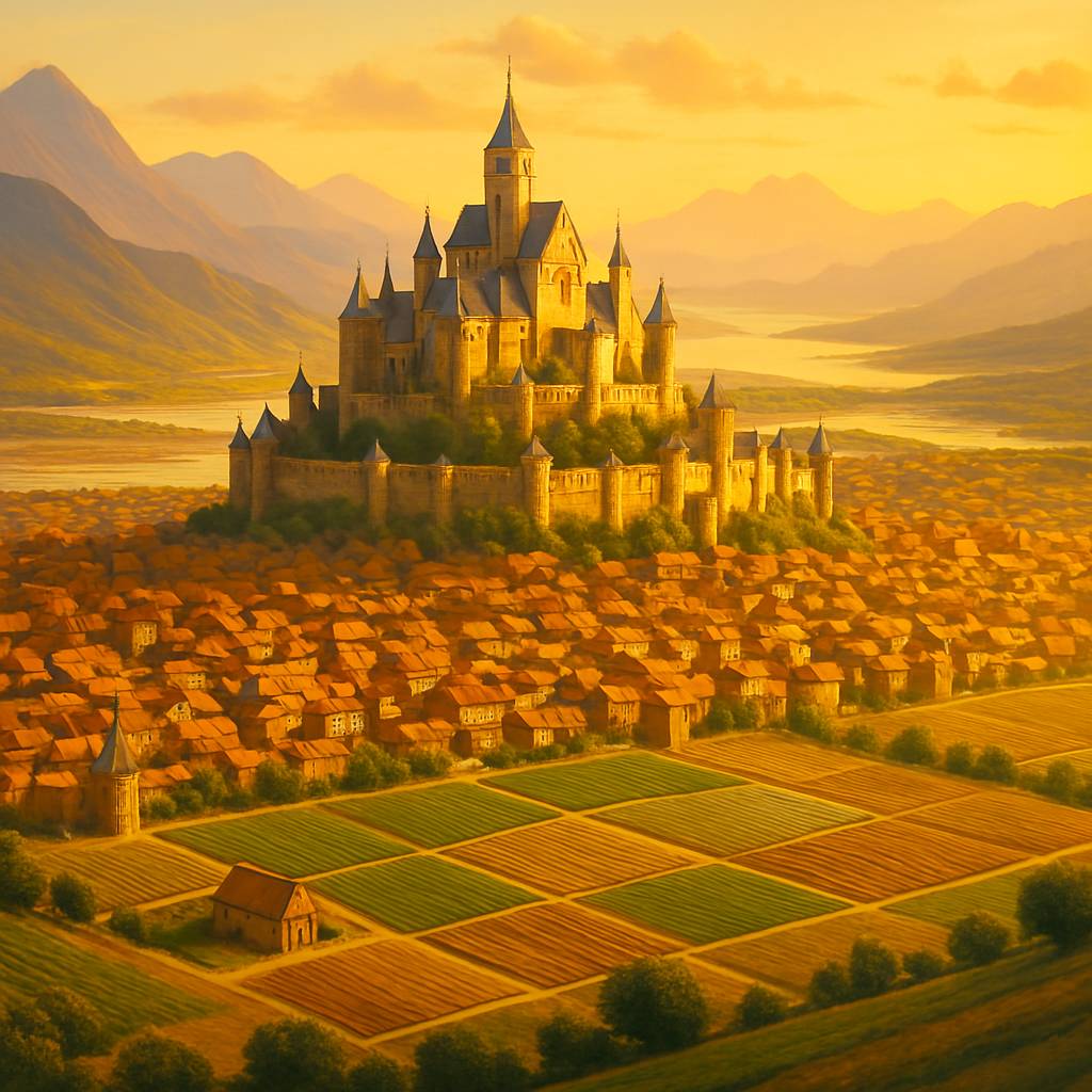 Они ехали около недели, преодолевая поля и луговые просторы, пока наконец не достигли Восточного города. Перед ними открылся величественный вид: большой каменный город, возвышающийся среди зелёных полей и лугов. В центре города стоял внушительный замок, который,