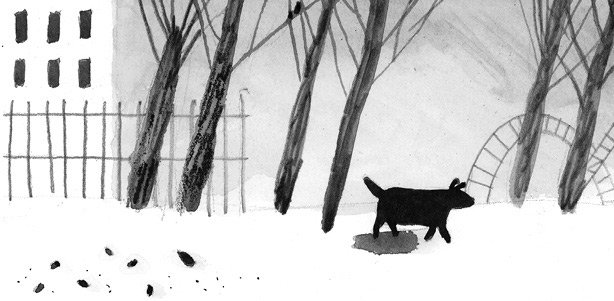 Большой чёрный бездомный пёс трусит по городку в поисках еды и друзей.