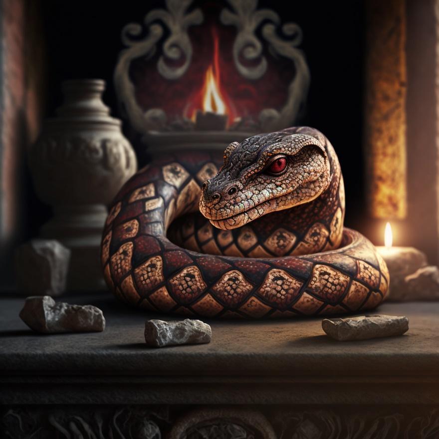 Что касается рептилий, то их было великое множество: от лахи́ров, вараноподобных сухопутных гигантов, поджидающих жертв из засады, до ядовитых эф, самых опасных, так как противоядия от их укусов не существовало. Или гишин, которые считались прекрасными домашними питомцами и охранниками. Этот тезис автор наглядно проиллюстрировал младенцем, мирно спящим в люльке в компании двух здоровенных змеюк. Считалось, что гишины очень умны, прекрасно понимают речь и никогда не нападают на хозяев. Даже если на них случайно наступить. Однако эти змеи имеют обидчивый нрав, поэтому в случае плохого обращения из дома уползают. Вот такой индикатор здоровой психологической обстановки в семье.