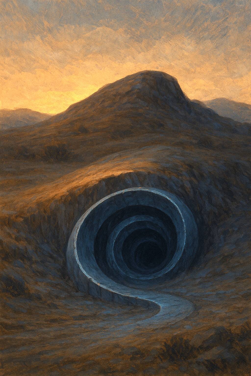 Впереди, у подножия холма, виднелась шахта – спиральная, как раковина. Её гладкие, почти зеркальные края светились слабыми оттенками синего и темно-серого.