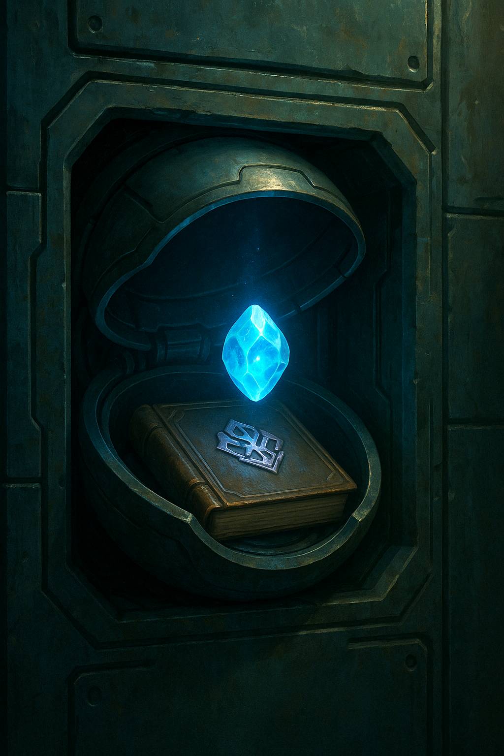 С округлившимися от восторга глазами и переминаясь с ноги на ногу, Сморг случайно наступил на какой-то выступ в полу. Внезапно в стене что-то щелкнуло и открылась большая квадратная ниша. Свет скользнул по её внутренней поверхности, отражаясь от полусферического купола. Внутри лежал небольшой ярко-синий кристалл. На первый взгляд – простой и прозрачный, но стоило взглянуть на него под другим углом, как в глубине вспыхивал странный отсвет – будто в самой сердцевине кто-то зажёг крошечную лампу и забыл её выключить.