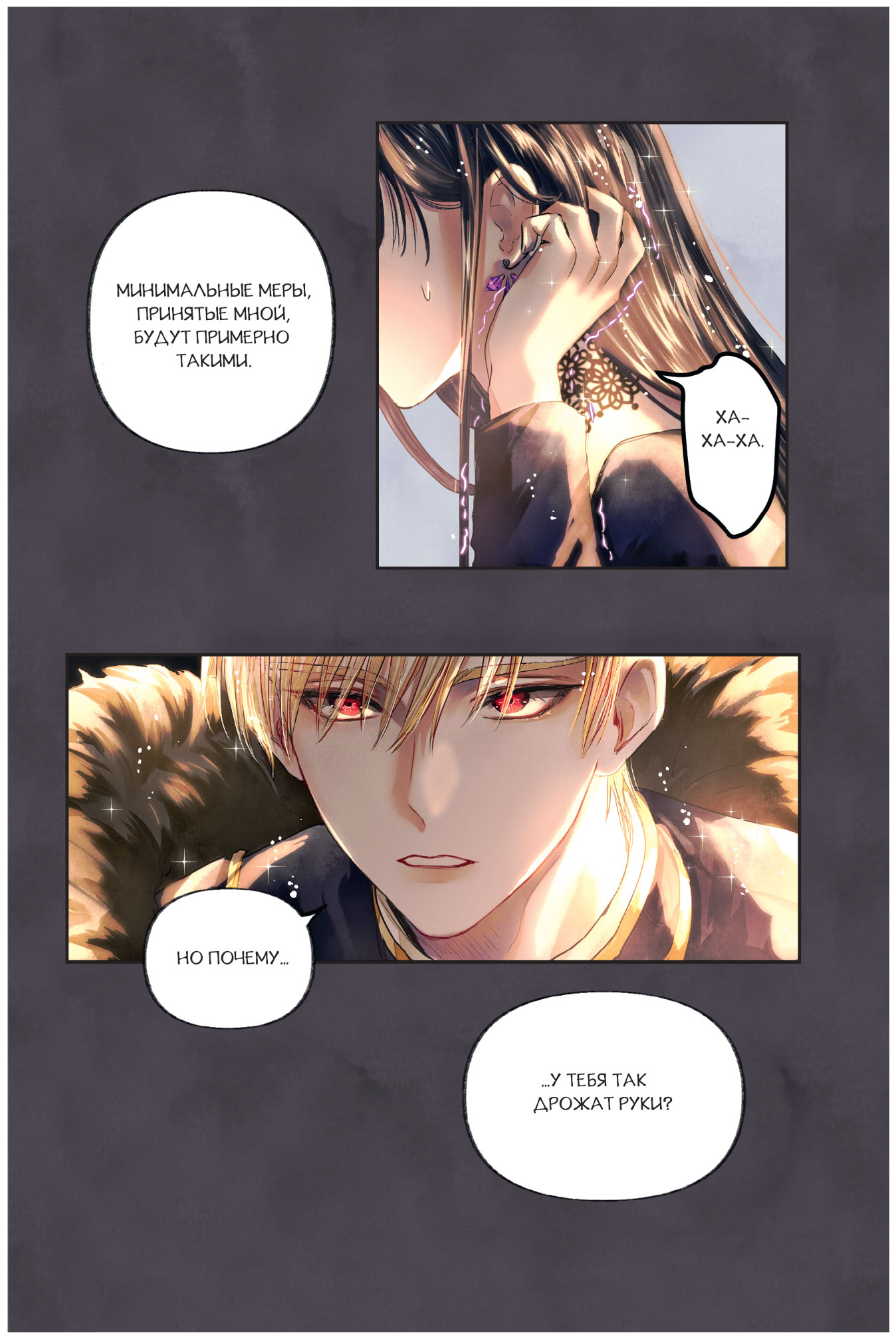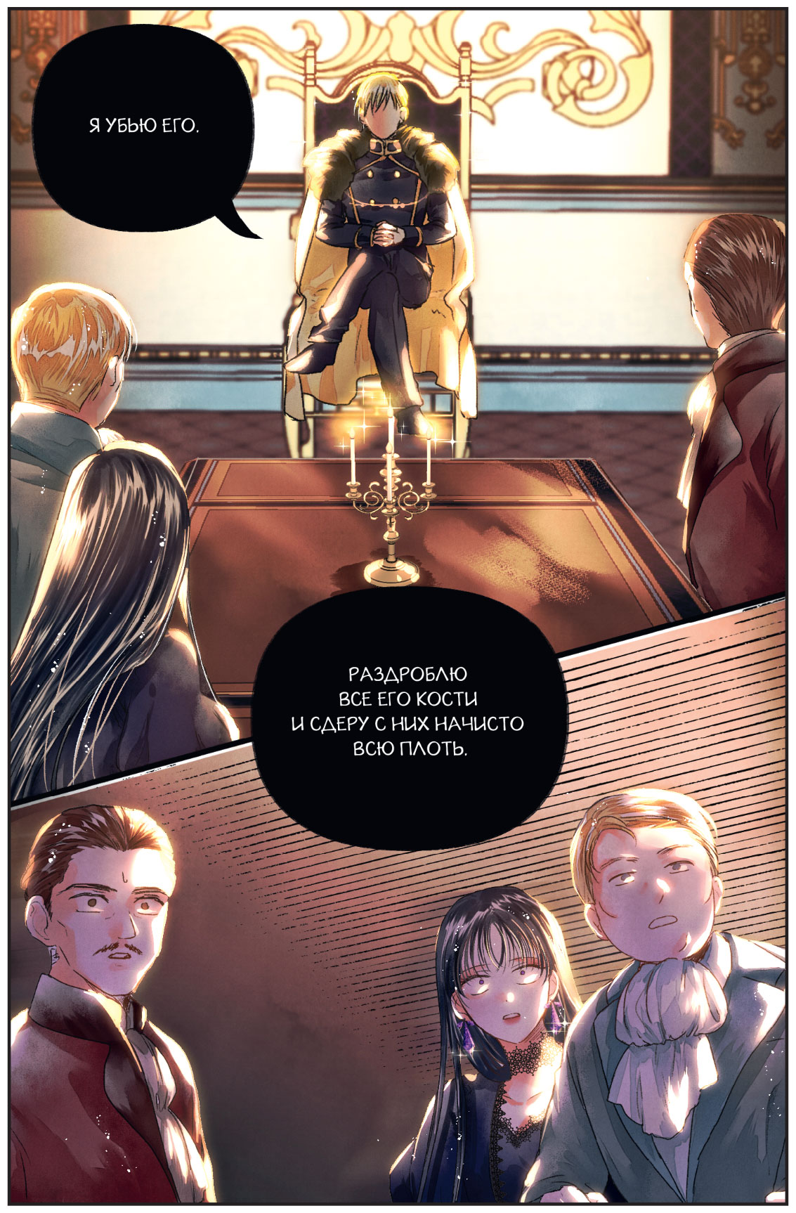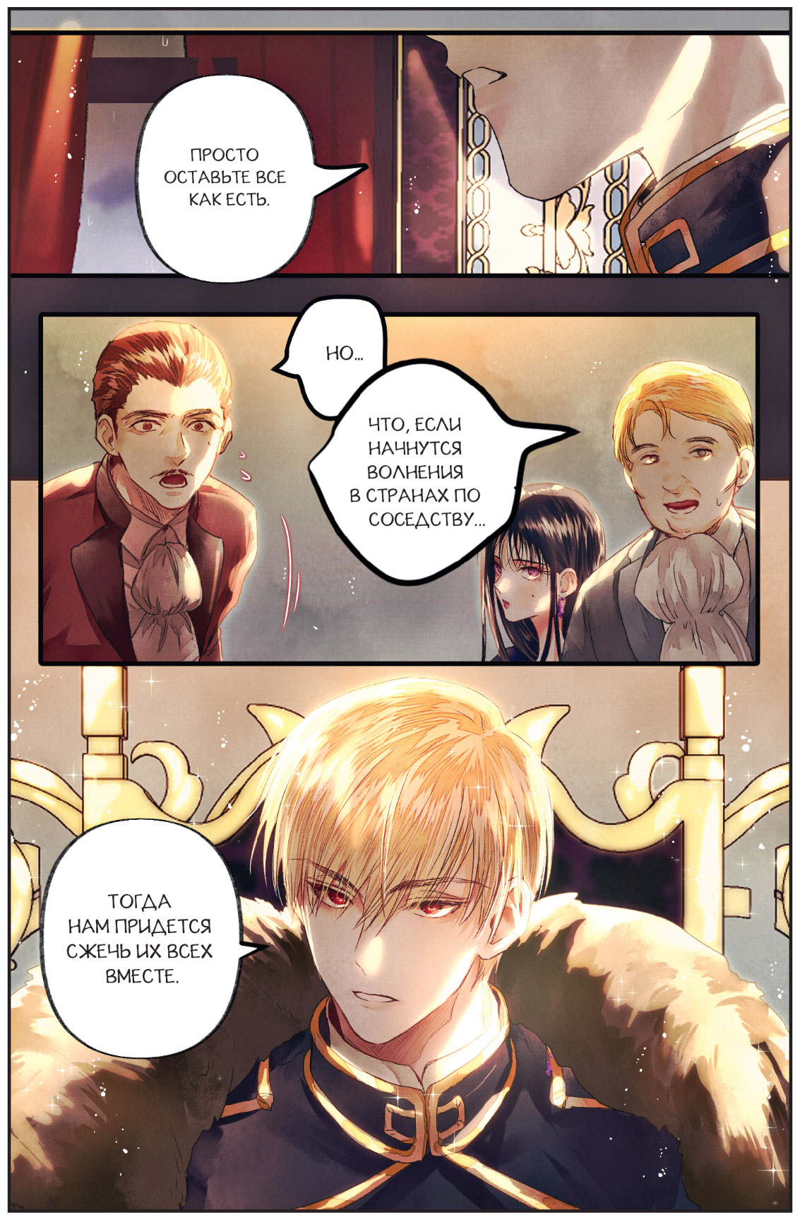 Этой реплики было достаточно, чтобы присутствующие вздрогнули. Ослепительно золотистые волосы сидящего на троне, в которых, казалось, поселился солнечный луч, взметнулись в такт с его кивком. А рубиновые глаза, сверкающие сквозь упавшие на лицо локоны, отливали таким холодным блеском, что было страшно встретиться с ними взглядом.