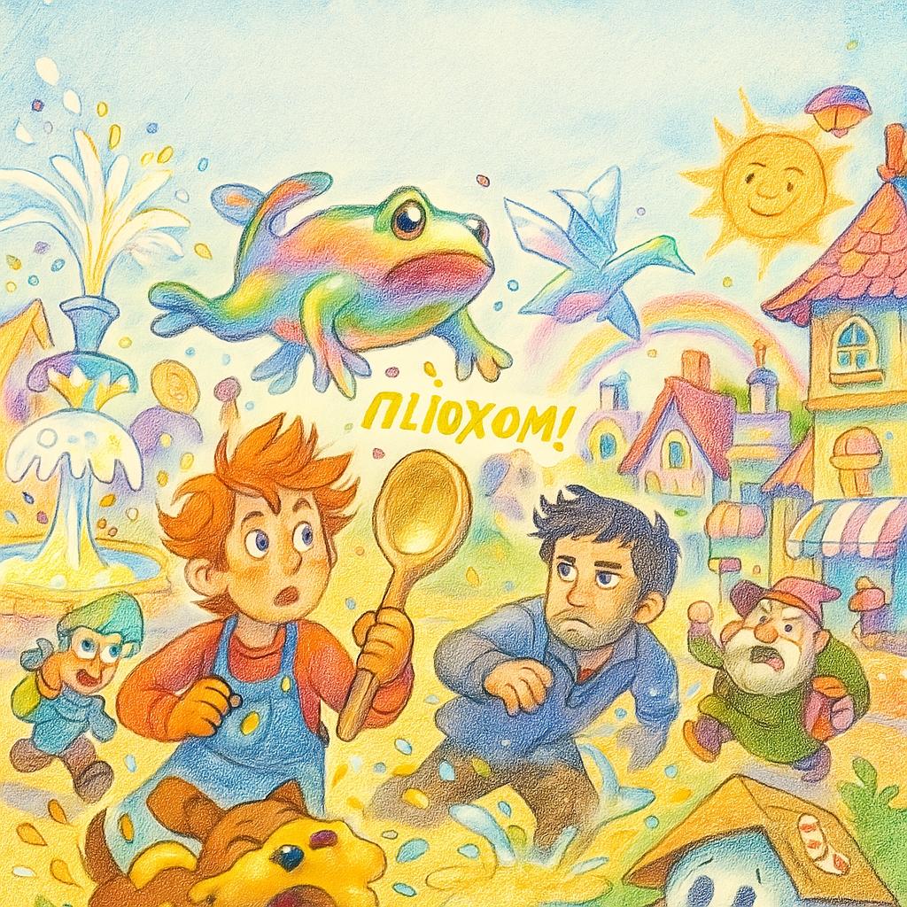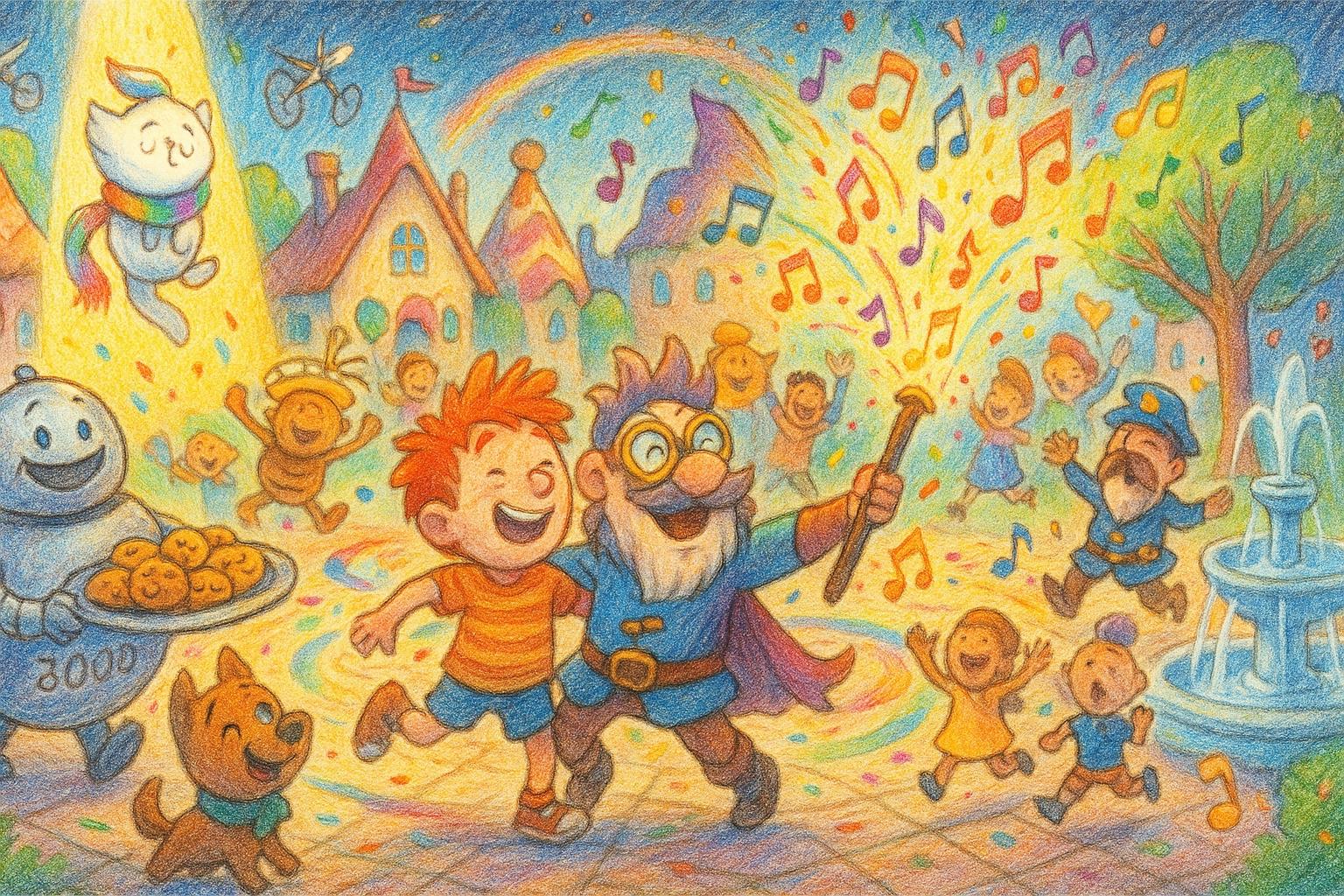 На Площади Первого Смеха кипела предпраздничная суета. Завтра – Большой Фестиваль Летающих Пирогов! Братья Блинчики, похожие на два розовых пончика в фартуках, с грохотом устанавливали свою новинку – «Пирогомет-5000», способный запускать вишневые вареники на орбиту Радужного Моста. Робот Плюшка-3000, весь в муке и блестках, терпеливо взбивал облака сладкой ваты размером с дирижабль. Даже Фонтан Сюрпризов сегодня плескался не просто водой, а шипучим лимонадом, периодически выстреливая в прохожих конфетти из засахаренных орехов.