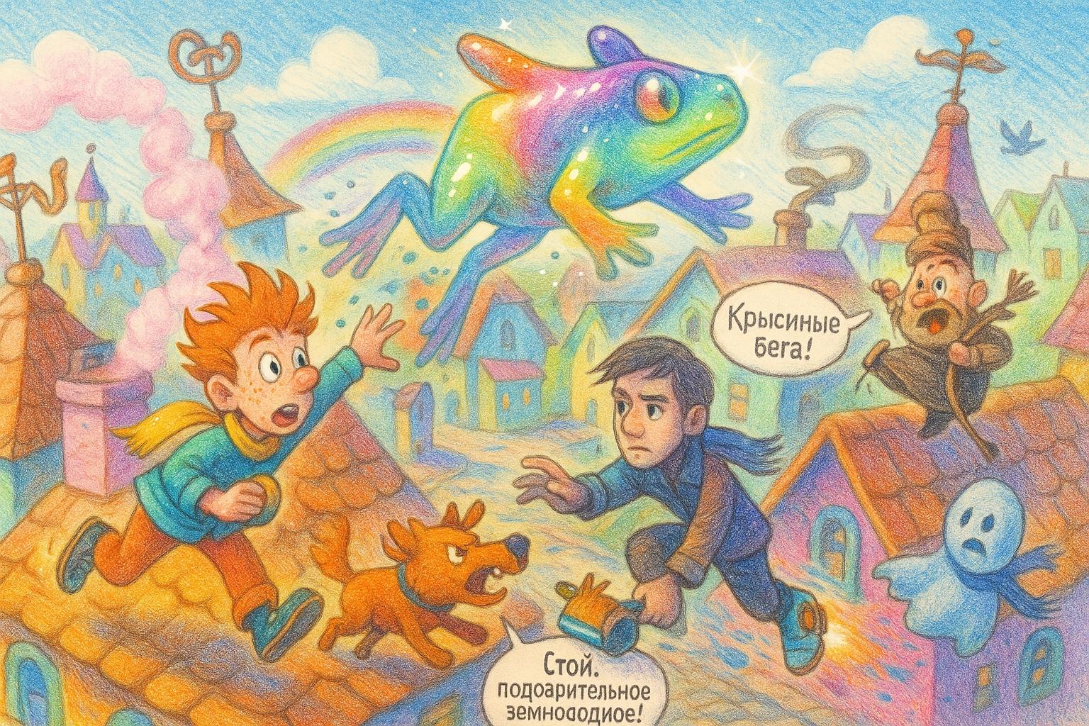 Экшен грянул, когда Джо-Джо и Гизмо (с ее новыми реактивными кроссовками "Быстроногов-1") шли мимо Кондитерской "Сладкий Сон". Из ее распахнутого окна, пахнущего ванилью и сдобой, вдруг выпрыгнула невообразимая штуковина. Огромная мармеладная лягушка! Но не простая, а полупрозрачная, как стеклянная. Она вся мерцала радужными переливами, словно внутри нее горел крошечный призматический фонарик. Каждый ее прыжок оставлял за собой короткий, липкий, радужный след, который тут же таял и испарялся, как дым. Фантом! И она явно спешила!