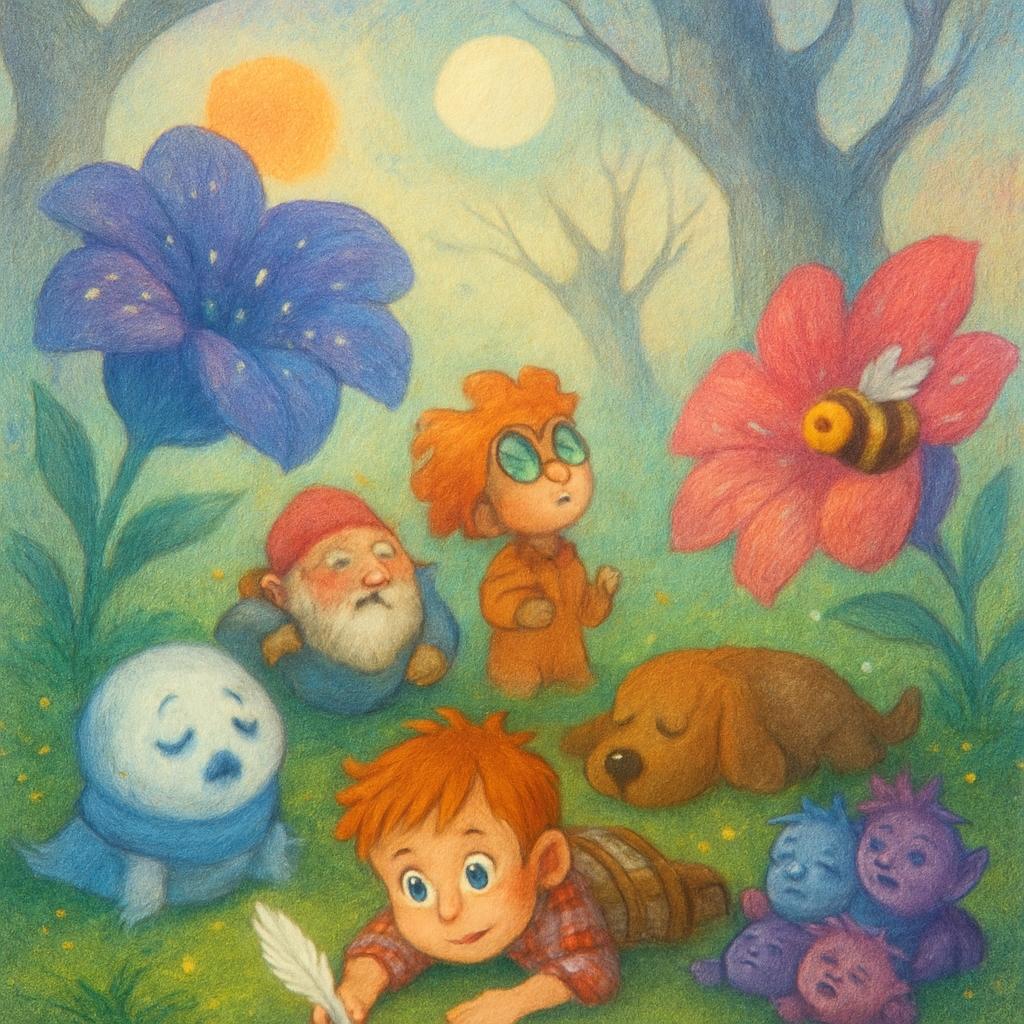 Они двинулись сквозь Сад Вечного Сна. Шли медленно, пробираясь сквозь заросли гигантских стеблей и обходя спящих пчел, висящих в воздухе, как диковинные украшения. Воздух был густым от ароматов, каждый вдох требовал усилия. Ворчун клевал носом, бормоча что-то про "варенье… с малиной… не сонное…". Гизмо шла, уткнувшись в свой "Фантомоскоп", который показывал лишь ровное зеленое свечение "сна". Бублик шел, пошатываясь, его нос едва работал. Пусик плыл чуть выше мха, его очертания расплывались. Даже Хохи брели сонной гурьбой, не пытаясь пакостить.