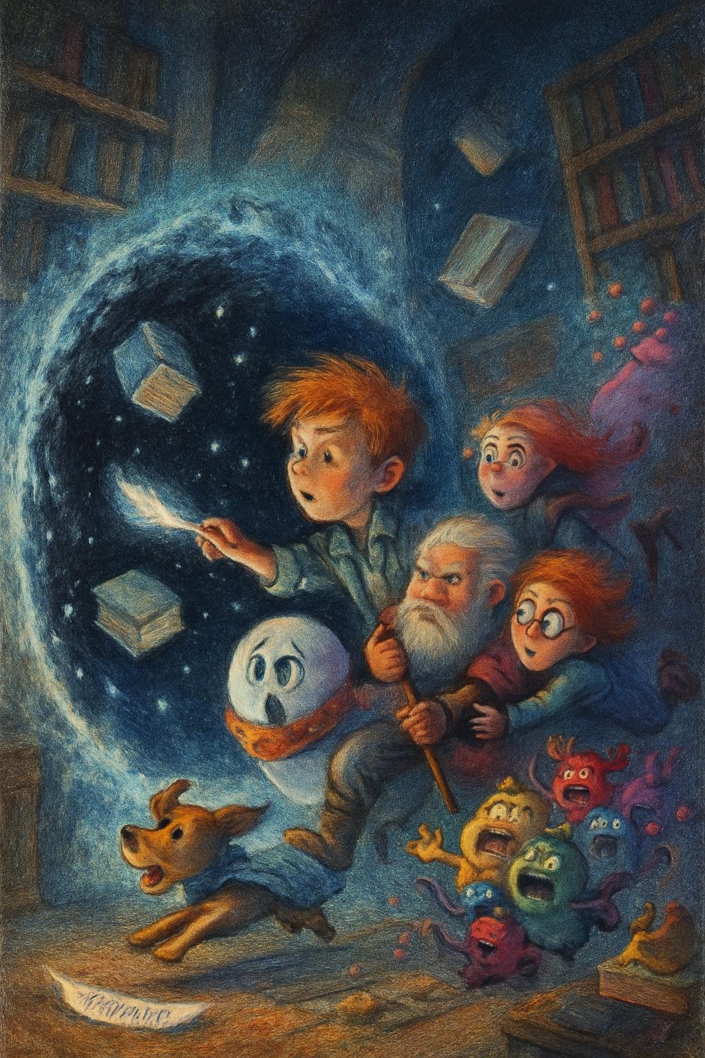 Начался хаос, немыслимый в этом царстве тишины. Казюля, визгливо хихикая: «Книжки-раскладушки! Пора раскрывать секреты!», выстрелила струёй едкой розовой слизи в ближайшую стеллаж. Книги, попав под удар, ахнули облаком древней пыли веков и начали беспорядочно хлопать страницами, как стая испуганных гигантских бабочек. Тома взлетали, падали, раскрывались с громким шумом, засыпая всех бумажным дождем. Бульк («Ик!»), пытаясь увернуться от летящего увесистого тома «Сонника для Недовольных Улиток», чихнул липкой прозрачно-зеленой массой прямиком на ногу Ворчуну.