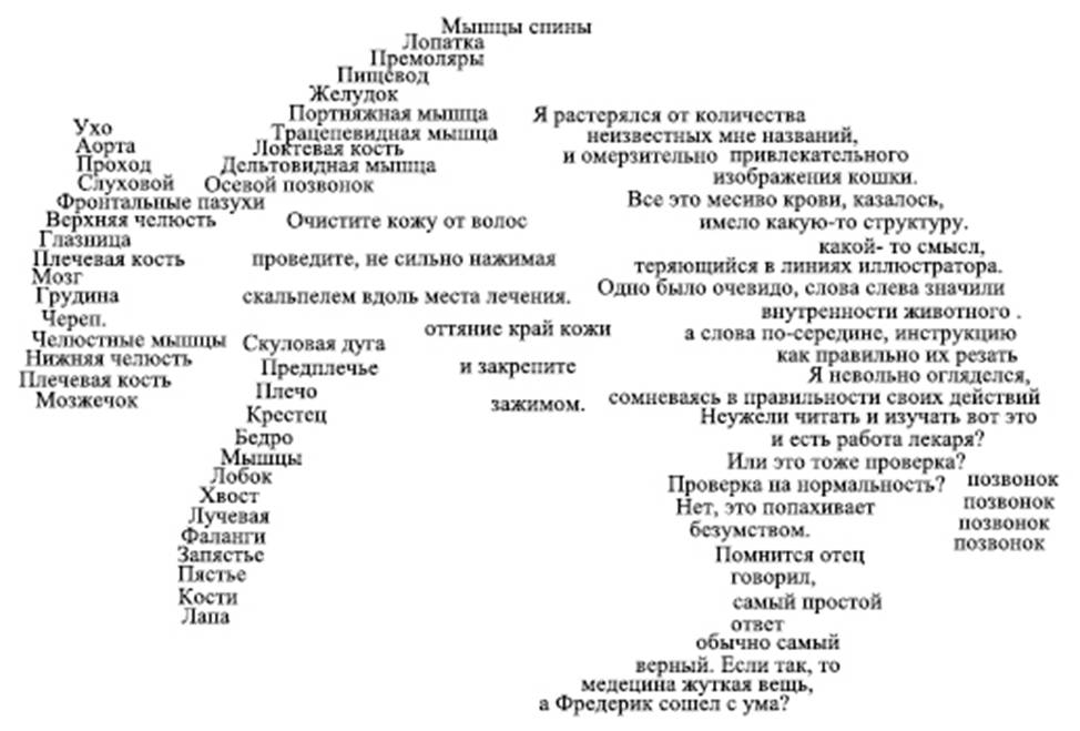 Так шло время я постепенно заполнял обратную сторону бумажки, книга постепенно уменьшалась, и хотя впереди было ещё много таких же, мой взгляд неизменно останавливался на той что была с иллюстрацией кошки. Солнце осветило край комнаты оранжевым сиянием, вечерело, бумажка была заполнена. Я улыбнулся: впервые за долгое время почувствовал приятное чувство успеха. Но мысль тут же вернулась к страшной странице: зачем было убивать невинную кошку? Зачем нужны эти лезвия, которые больше похожи на орудия пытки, чем на инструменты для лечения? Я с дрожью в пальцах коснулся заветной рукописи и вдруг дверь распахнулась. На пороге, пошатываясь, появился Фредерик. От него пахло пивом. Он подошёл ближе и с любопытством заглянул мне через плечо. Я вздрогнул, представив, как эти самые щипцы и ножи впиваются в моё тело.