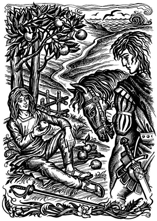 Тут лошадь Зара резко остановилась, запрядав ушами и скосив глаза куда-то вбок. Взглянув вправо, рыцарь увидел, что в двух шагах от его коня, прямо на земле, сидит на расстеленном плаще молодой человек и пристально смотрит на него. Видимо, он уже давно наблюдал за ним и Зар не заметил его лишь оттого, что слишком погрузился в собственные мысли. Вооруженный всадник явно не вызывал ни робости, ни опасений у незнакомца: он смотрел открыто и, казалось, почти был готов улыбнуться. Поза его была непринужденной, одна рука покоилась на согнутом колене, а в другой он держал надкушенное яблоко. Рядом с ним на плаще было рассыпано еще несколько яблок, сорванных, несомненно, с тяжелой ветви, которая в двух шагах от него спускалась с изгороди. За спиной у незнакомца виднелась длинная рапира с потемневшей гардой, которую он, похоже, только что начистил до блеска. Тут же рядом валялся пояс с ножнами. Если бы не оружие и проницательный, несколько дерзкий взгляд серо-голубых глаз молодого путешественника, то по одежде можно было принять его за простолюдина, так бедно он был одет, в видавшие виды штаны и домотканую рубаху из грубого льна. Светлые волосы, от природы легкие и пушистые, доставали ему до плеч, придавая его облику мягкость и вместе с тем задор. Рыцарь чувствовал, что этот человек чем-то похож на него самого и знаком с трудностями одиноких переходов, быть может, без пищи и крова. Бродяга явно не уступал Зару ростом и был несомненно вынослив и силен, но в его силе ощущалась почти неуловимая грация. Он был не слишком широкоплеч, однако мужественного сложения, с сильными крупными руками и стройным станом, хотя еще по-юношески худ и длинноног. Зар обратил внимание, что на ногах у него греческие сандалии – не слишком типичная для Франции обувь. Старые и потертые в походах, они тем не менее придавали его узким ступням какое-то особенное изящество… За исключением рапиры и сандалий, незнакомец не был обременен никакой ношей: ни сумки, ни даже узелка, и Зар был очень далек от того, чтобы счесть его хозяином пресловутого яблоневого сада. Молодой рыцарь и бродяга-француз несколько мгновений с нескрываемым интересом смотрели друг на друга.