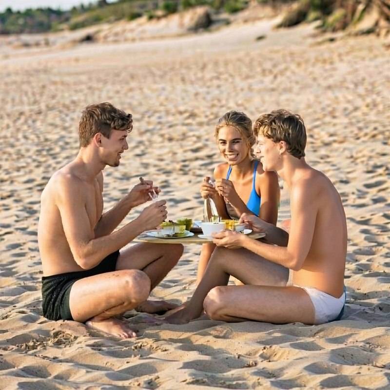 Пройдя, по его меркам, километров шесть, Воронов вдруг увидел на небольшой ровной площадке, огороженной обычной ленточкой, странную группу из трёх молодых людей. Создавалось впечатление, что это приятели устроили пикник на пляже, хотя ни моря, ни другого водоёма вблизи не просматривалось. Там были двое парней, примерно 25 – 27 лет в одних плавках и с ними молодая девушка лет 22-ти в красивом голубом купальнике и роскошными светлыми волосами, красиво развивавшихся на ветру. Они весело общались в процессе поедания пищи, похожей на бутерброды и пирожки, и абсолютно не обращали внимания на идущего к ним человека.