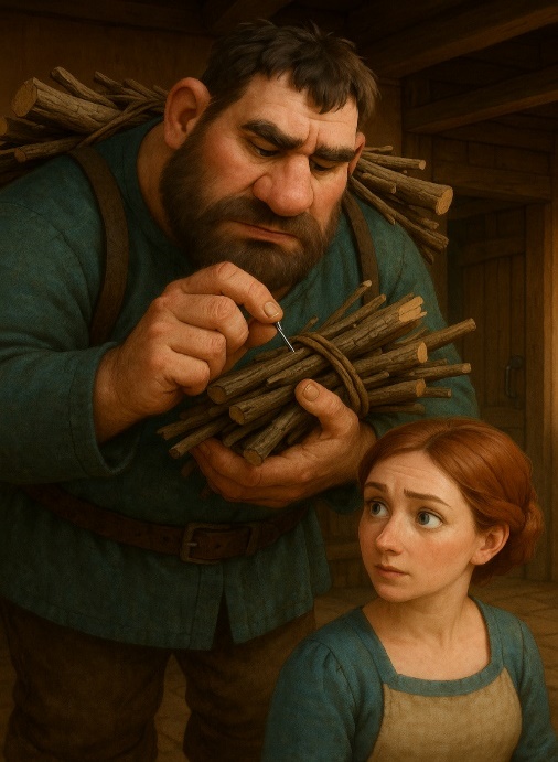 Алангазар, великан из военного полка, однажды взял месячный отпуск и отправился домой за дровами. Он пошёл в лес, собрал охапку хвороста, связал в пучок и понёс на спине. Ноша была тяжёлой, и он шёл, опустив глаза. И тут – нашёл иголку! Аккуратно воткнул её в пучок дров, чтобы не потерять.