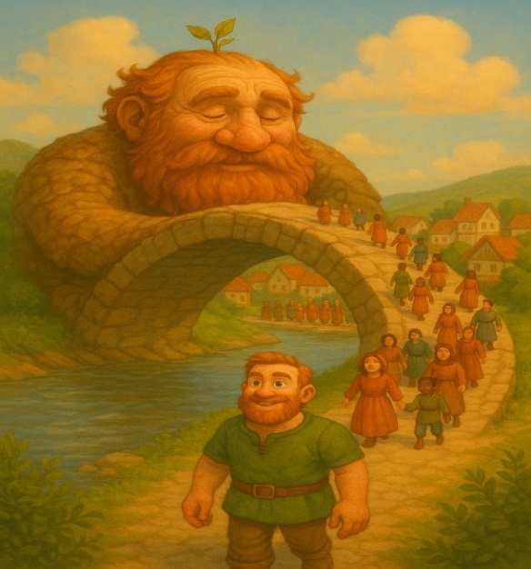 Его тело разрушилось, но его кость стал мостом. С тех пор люди ходят по нему – из деревни в деревню, с рынка домой, с надеждой в сердце. Мост из великана, который выбрал быть полезным даже в своей последней минуте.