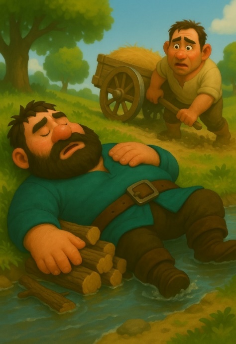 Тем временем мимо ехал крестьянин с телегой. Колесо застряло в грязи. Он увидел лежащего великана.