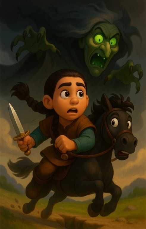Юноша не слез с коня. Нагнулся, выхватил кинжал сам – и в этот миг "бабушка" превратилась в ужасную ведьму. Она взвыла, вырастая ввысь, её плащ превратился в тучу, руки в когти, а глаза сверкнули зелёным огнём. Эртоштук ударил шпорами коня – и пустился в бег, но ведьма мчалась следом, не отставая ни на шаг.