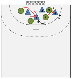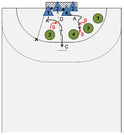 - If an attacking player manages to break through (C), he passes the ball to a teammate in the goal (D) who then also tries to break through.
