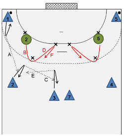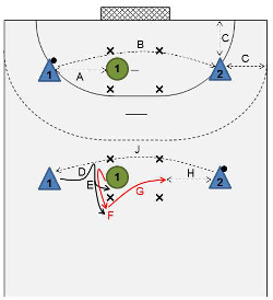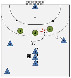 → Pass from within the 9-meter zone to one of the feeders/receivers (C), one point.