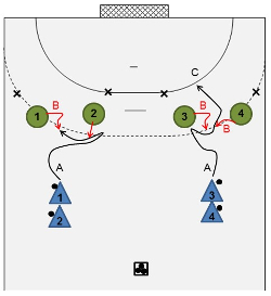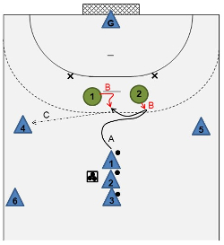 - Upon the coach’s starting signal, the two attacking players with the ball try to cross the 6-meter zone as fast as possible (A) and to leave it (C) (while holding the ball in their hands).