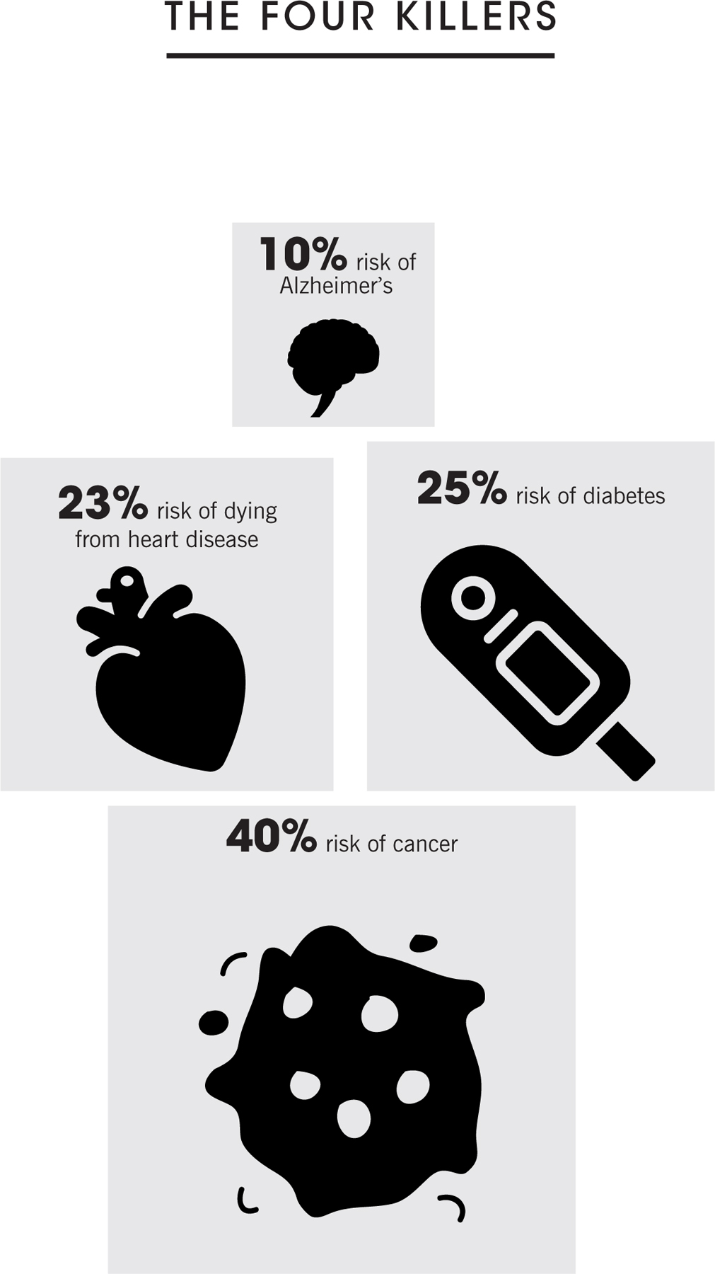 There is new evidence that maintaining normal amounts of muscle strength as you age can help ward off this killer. In a study following five thousand people for over twenty-five years, participants were given regular strength tests. The risk of diabetes was slashed by 32 percent in those with even moderate muscle strength as opposed to those with low muscle strength.12 The reduced risk did not change if the participants were even stronger, so you don’t have to get ripped to live longer, but you should avoid carrying excess fat.