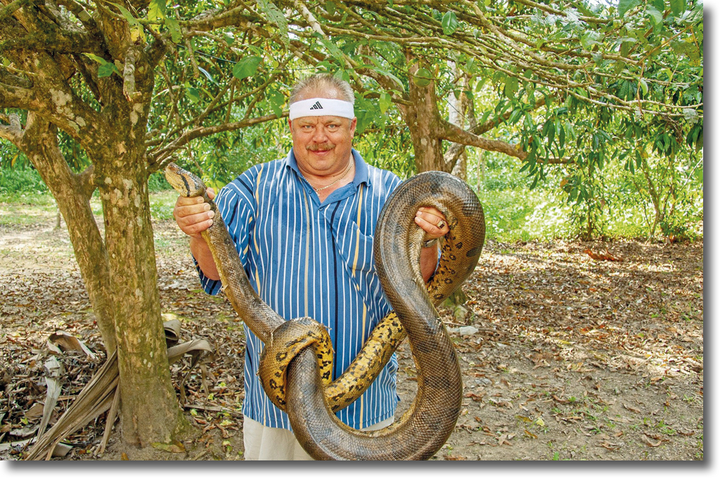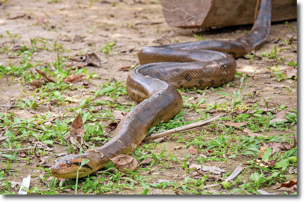 В амазонских лесах анаконда – одна из самых опасных змей, которая не только убивает скот, но и охотится на человека. Проводник рассказывал, что отряд, с которым много лет тому назад шёл его знакомый, расположился на высоком берегу, где удобно было подвесить гамаки. Там был один человек, который любил спать в стороне от всех. Однажды ночью они услышали сдавленный крик со стороны спящего товарища. Когда включили фонари и бросились к нему, то увидели страшную картину: огромной величины анаконда обвивала гамак с тем человеком. У кого было оружие, начали стрелять, после чего змея уползла в реку. Человек был мёртв, у него оказались переломанными все кости.