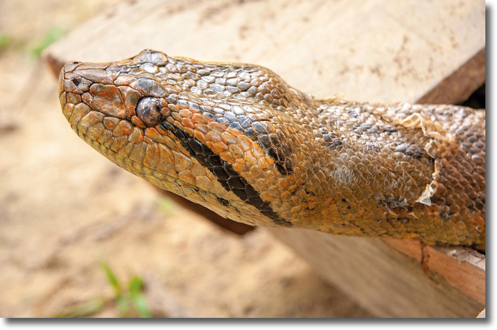 Змею держали в заколоченной лодке, видимо, чтобы специально показать нам. Анаконда оказалась крупной, метров шесть длиной, и очень сильной.