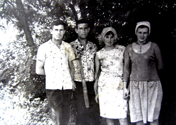 И вот наступило 3-е июля 1966 года, – начало моих проводов в армию. На фотоснимке: слева – мой старший брат Анатолий, я стою возле него с лентами. Рядом со мной – сестра Нина; крайняя справа – жена Анатолия, Валя.