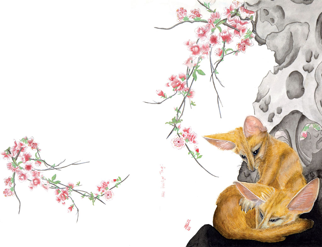 Феньки в поисках счастья отправились в путь. Они считали, что пределом их мечтаний о счастье станет дом – это пещера в скале, которая даст им ощущение защиты и без-опасности, уюта и тепла, которая всегда будет укрывать от дождя, ветра, зноя. Дарога была дальняя, но грезы о счастье в далекой пещере придавали силы двигаться вперед, увлекали и помогали стойко преодолевать препятствия и все трудности, встречающиеся на пути. Цель была столь заманчивой и это вдохновляло. Случилось одному из феньков в пути захворать. У него заболела лапка. Он ее подвернул, споткнувшись о камень и она распухла. Но дом был совсем рядом, и это придавало сил.