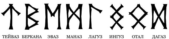 Третий атт начинается с Те́йваз – руны бога Тюра. Он известен в первую очередь по мифу, где описывается его жертва ради спасения мира. Для того чтобы сковать могучего волка Фенрира, которому суждено вырасти и проглотить Солнце, Тюр пожертвовал своей рукой, сунув ее хищнику в пасть. Никто из богов больше не отважился это сделать.