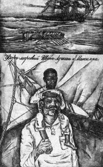 Но матросы, сами бывшие крепостные и знавшие по собственному опыту, как еще в недавнее время «полосовали» им спины, и без Артюшкиных прикрас жалели арапчонка и посылали по адресу американского капитана самые недобрые пожелания, если только этого дьявола уже не сожрали акулы.
