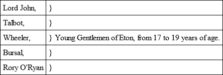 'Mr. Ford, Captain, with eight Gentlemen to attend him as servitors'Mr. Sarjeant, Marechal'Mr. Bradith, Colonel'Mr. Plumtree, Lieutenant'Mr. Vince, Ensign'Mr. Young, College Salt-Bearer; white and gold dress, rich satin bag, covered with gold netting'Mr. Mansfield, Oppidin, white, purple, and orange dress, trimmed with silver; rich satin bag, purple and silver: each carrying elegant poles, with gold and silver cord'Mr. Keity, yellow and black velvet; helmet trimmed with silver'Mr. Bartelot, plain mantle and sandals, Scotch bonnet, a very Douglas'Mr. Knapp, flesh-colour and blue; Spanish hat and feathers'Mr. Ripley, rose-colour; helmet'Mr. Islip (being in mourning), a scarf; helmet, black velvet; and white satin'Mr. Tomkins, violet and silver; helmet'Mr. Thackery, lilac and silver; Roman cap'Mr. Drury, mazarin blue; fancy cap'Mr. Davis, slate-colour and straw'Mr. Routh, pink and silver; Spanish hat'Mr. Curtis, purple; fancy cap'Mr. Lloyd, blue; ditto'At the conclusion of the ceremony the Royal Family returned to Windsor, and the boys were all sumptuously entertained at the tavern at Salt Hill. About six in the evening all the boys returned in the order of procession, and, marching round the great square of Eton, were dismissed. The Captain then paid his respects to the Royal Family, at the Queen's Lodge, Windsor, previously to his departure for King's College, Cambridge, to defray which expense the produce of the Montem was presented to him.