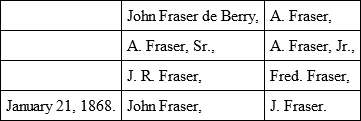 At a meeting of the "Frasers" of the Province of Quebec, held at Mrs. Brown's City Hotel, on the 8th February, 1868, Alexander Fraser, Esq., notary, ex-Member for the County of Kamouraska, now resident in Quebec, in the chair; Mr. Omer Fraser, of St. Croix, acting as Secretary.