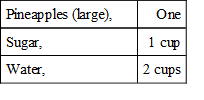 The cup of sugar and two cups of water were measured into the saucepan, which she placed over the fire and let boil ten minutes, then the pineapple was dropped in and cooked until tender, or until you could pierce it easily with a silver fork.
