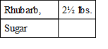 If the rhubarb is pretty in color and young and tender, mother told Adelaide that she did not need to peel the stalks, but just wash and wipe them clean and cut them in small pieces with the little sharp knife. Then she weighed the fruit and allowed one-half pound of sugar to each pound of rhubarb. Both sugar and rhubarb were put in the saucepan and placed over the fire to come very slowly to the boiling point. Adelaide stirred constantly with a wooden spoon to prevent burning, and as soon as it had boiled fifteen minutes she poured it into the sterilized pint jar. The silver knife she inserted between the jar and the fruit, to let all air bubbles rise to the top and break. After the new rubber was dipped in boiling water and placed over the jar smoothly, Adelaide sealed it quickly, then stood the jar upside down out of the way of any draft. In the morning she inspected the jar carefully to be sure that there were no leaks, wiped off all stickiness with a damp cloth, pasted on the label and stored the jar away in the preserve closet.