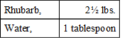 Adelaide washed and wiped each stalk thoroughly, then cut it into small pieces. These she put in the saucepan with a tablespoon of cold water to keep from burning, and stirred with a wooden spoon. She let the fruit heat very gradually and boiled slowly for fifteen minutes. It was then ready to can, and Adelaide poured the rhubarb into the sterilized pint jar at once, after which she inserted a silver knife between the jar and the fruit, to let all air bubbles rise to the top and break. Next came the new rubber, which she dipped in boiling water, placed over the top smoothly, then sealed quickly. Standing the jar upside down she stood it out of the way of any draft. In the morning Adelaide examined the jar carefully to be sure that it did not leak, wiped off the outside with a damp cloth, pasted on the label and stored the jar away in the preserve closet.