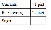 The currants and raspberries Adelaide picked over and kept separate. She did not forget to look carefully in the center of each raspberry to be sure that there were no little worms. After washing the currants, placing them in the colander and dipping it up and down several times in a pan of clear cold water she poured them into the saucepan and mashed them with the wooden potato masher. Adelaide washed the raspberries in the same manner, but stood them aside to drain while the currants were cooking. The currants simmered slowly for half an hour (or until the currants looked white), and then the juice was strained through the jelly bag. Adelaide returned the juice to the saucepan, and added the sugar. (The currants and berries had been weighed after washing them, and to each pound of fruit she measured three-fourths of a pound of sugar.)
