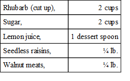 Adelaide next measured out a fourth of a pound of seedless raisins. Upon these she poured boiling water which stood a minute or two, then she drained them. After looking them over carefully to remove any stems, she added them to the rhubarb, sugar, etc. Twelve or fourteen large walnuts were sufficient to crack. The meats Adelaide put through the meat chopper and added to the rest of the good things.