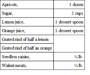 Adelaide wiped the apricots thoroughly with a damp cloth, then cut them in halves with a silver knife and removed the stones. These she placed in a saucepan, poured over them two cups of sugar, a dessert spoon each of lemon and orange juice, and the grated rind of half a lemon and half an orange. Next she measured out a fourth of a pound of seedless raisins and covered them with boiling water for a few minutes, after which she drained them and picked off any stems. Twelve or fourteen large walnuts were sufficient to crack, and the walnut meats and the raisins Adelaide put through the meat chopper, then added these to the fruit in the saucepan.