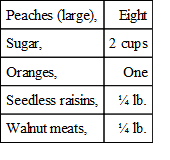 To remove the skins from the peaches easily, Adelaide poured boiling water over them. Letting them stand for a minute or two, she then peeled off the skins with a silver knife and sliced the peaches into small pieces, throwing away the stones. Placing the peaches into a saucepan she added two cups of sugar. After weighing out one-fourth of a pound of seedless raisins she covered them with boiling water for about a minute, drained, and picked off any stems. The walnuts (twelve or fourteen large ones) she cracked and put with the raisins.