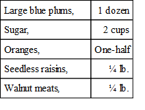 After washing and wiping the plums thoroughly, Adelaide cut them in halves with a silver knife, and removed the stones. Placing them in the saucepan she poured two cups of sugar and the grated rind of half an orange over them. Twelve or fourteen large walnuts were cracked and the meats taken out. Over the quarter of a pound of raisins (which she weighed) Adelaide poured boiling water. These stood thus for about a minute, then she drained off the water and picked out the stems.