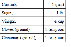 Adelaide picked over the currants and removed the stems. Putting the currants into the colander, she dipped it up and down several times in a pan of clear cold water, then set it aside to drain. Into the saucepan she poured the currants, added one pound of sugar, a half a cup of vinegar, and a teaspoon each of cloves and cinnamon.